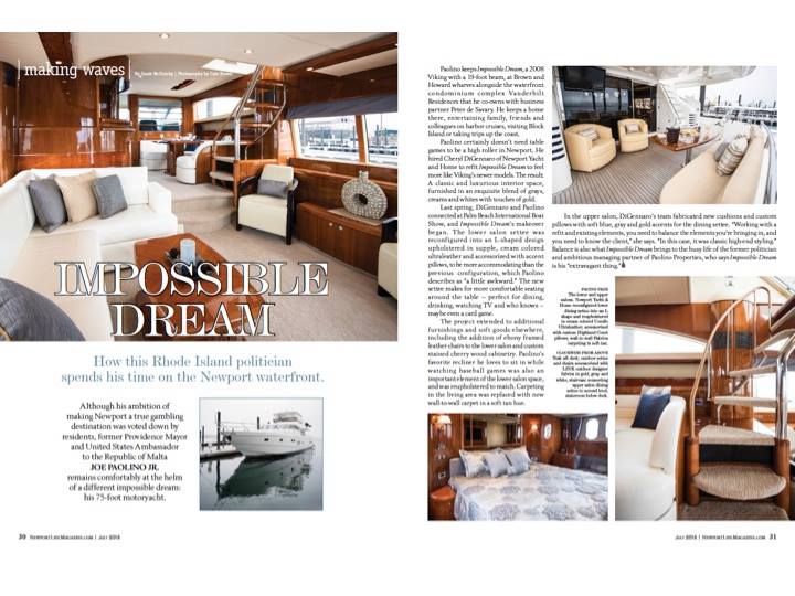 " I have known and worked with Cheryl DiGennaro of Newport Yacht Interiors for many years. I have always known Cheryl to be professional, attentive to the wishes of her customer, hard working, knowledgable in her trade and delivers the highest quality of work. She is a hard working business owner with a strong entrepreneurial spirit that contributes to her success. Cheryl is the best in her field which is why I return to her for any work I need to have done onboard my yacht, Impossible Dream."